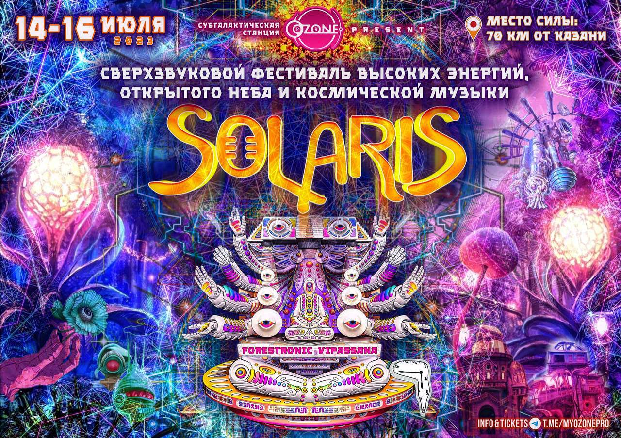 В месте силы и открытого неба, в атмосфере сверхъестественных явлений и светящихся людей, в параллельном от цивилизации мире, в окружении живого леса на берегу реки, пройдет специальный музыкальный ретрит для всех последователей электронной музыки и возникнет кратковременное измерение, включающее в себя две музыкальные зоны, декорированные лесные пространства, территорию оздоровительных, и трансцедентальных практик, а также все необходимое для комфортного сверхзвукового проживания всех житилей Solaris: домики перезагрузки, палаточный лагерь, маркет, кухню, воду, баню и душевые кабины, охраняемую стоянку, а также точки приземления инопланетных визиторов, порталы смены реальности, телепатические стабилизаторы и ловушки времени.